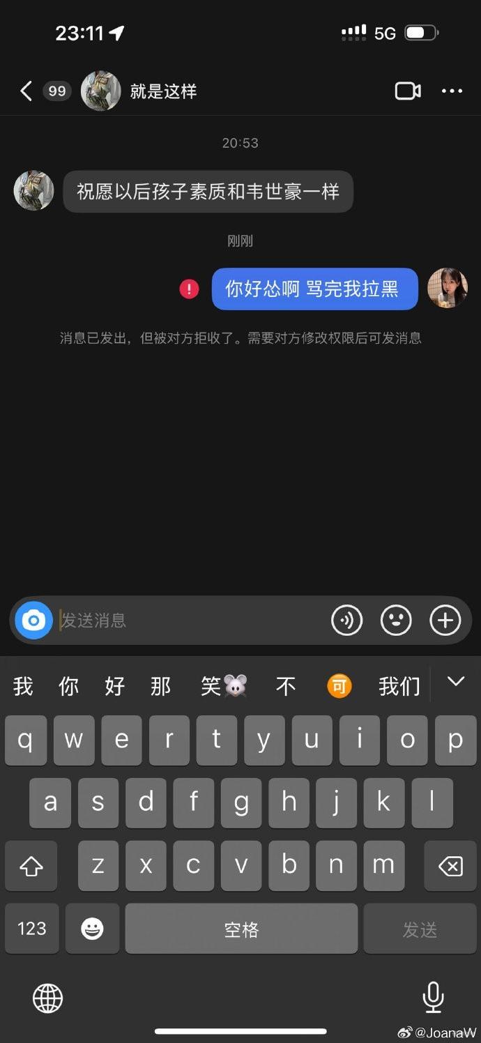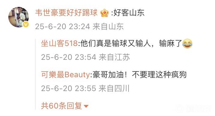 赛后,韦世豪妻子晒出了部分球迷辱骂的留言。韦世豪在评论区写道:“好客山东”