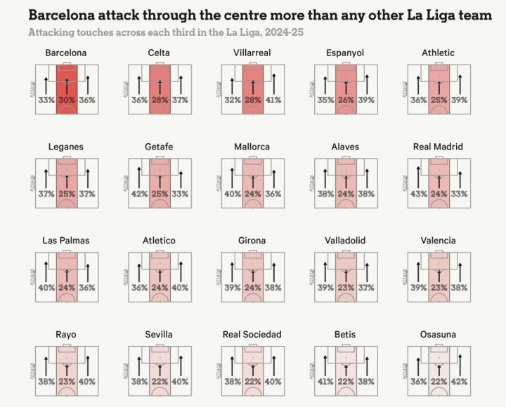 亚马尔和拉菲尼亚的耐力帮助巴塞罗那在整个赛季中保持了高水平的表现,只有全勤的佩德里出场时间更多。但如果其中一人进入伤病名单,边路的替补选择就显得薄弱,法蒂和保-维克托不被认为达到了球队所需的水平。尽管他们的轮换和精准的传球组合很聪明,但巴塞罗那上赛季在控球时是最狭窄的球队之一。如下面的图表所示,没有一支西甲球队通过中路攻击的比例更高。