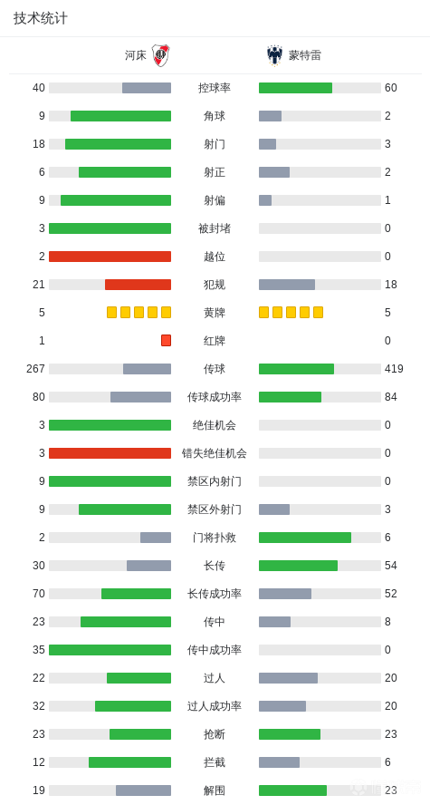 另外,蒙特雷队在控球率上占据优势(59%),而河床队则完成18次射门,6次射正,3次错失绝佳机会,还有2次越位。