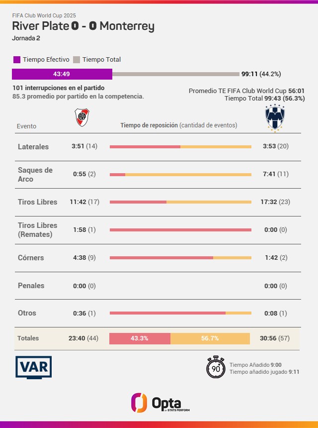 据opta统计,本场比赛有效比赛时间仅为43分49秒,而比赛的总时长为99分11秒,有效比赛时间占比仅为44.2%。