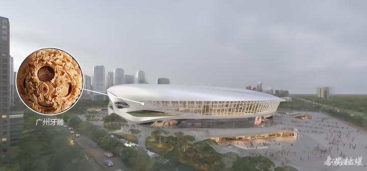 目前,球场内部(施工)也正在紧张地开展中。广州足球公园项目设计团队表示:“室内设计将继续解构‘瑞玉’、‘牙雕’元素,同时也将岭南的色彩、质感在观众入口、共享平台、观众看台等重点空间进一步延续传承。”