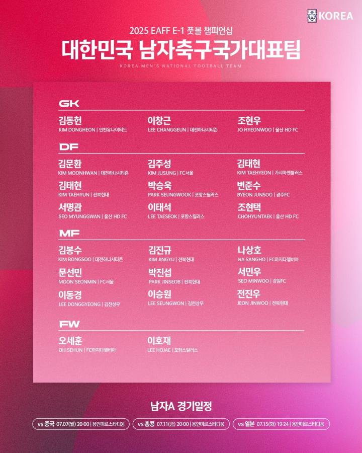 北京时间6月23日,韩国公布了东亚杯大名单。文宣民、赵贤祐领衔,留欧球员缺席,首战将迎战国足。