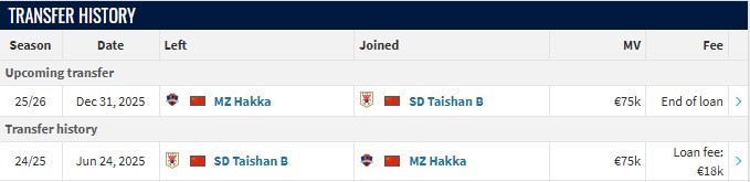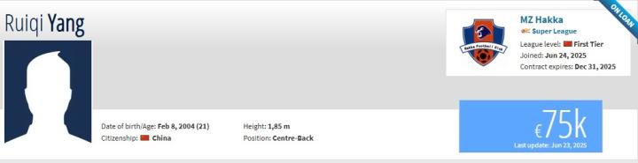 北京时间6月24日,德转更新,山东泰山21岁后卫杨瑞琦租借加盟梅州客家。