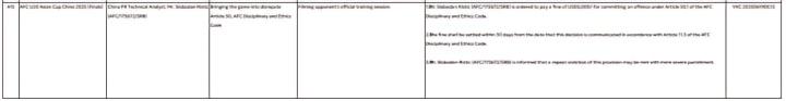 据悉,斯洛博丹-里斯蒂奇违反了亚足联纪律与道德准则第50.1条,若再次违反本条款,将面临更严厉的处罚。