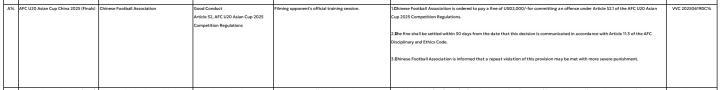 因U20国足分析师斯洛博丹-里斯蒂奇偷拍对手训练课,中国足协被罚款2000美元,中国足协违反了2025年亚足联U20亚洲杯竞赛规则第52.1条,若再次违反本条款,将面临更严厉的处罚。