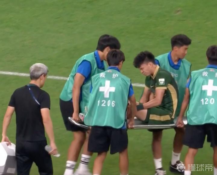 记者徐毅称,第67分钟,王钰栋在比赛中受伤被担架抬出场。王钰栋的这次受伤并非是在对抗中产生的,而是自己崴到了脚,被抬出球场的时候左膝位置进行了简单的包扎和冰敷。