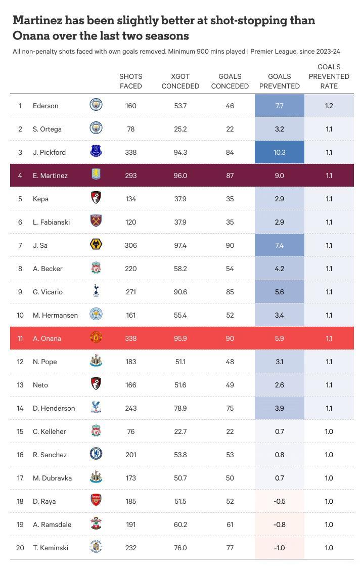 马丁内斯不是完美的门将。奥纳纳也不是。统计数据无法量化门将位置的每一个层面和细微差别,但两人在扑救产出方面的差距并不巨大。自2023-24赛季开始以来,马丁内斯面对的射门次数少于奥纳纳,数据表明他阻止了更多的预期进球。
