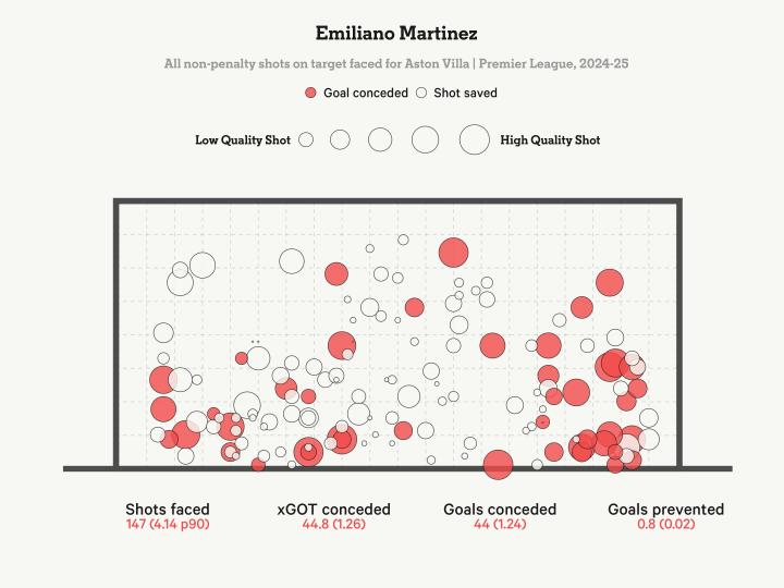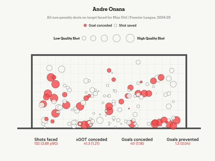 然而,奥纳纳在过去两个赛季也展现了一些扑救能力。他的实际丢球数与“预期射正丢球数”(xGOT,衡量一个门将在面对相同射门时会丢多少球)之间的差值尚可接受。他在2024-25赛季结束时比马丁内斯多一次英超零封(9次)。