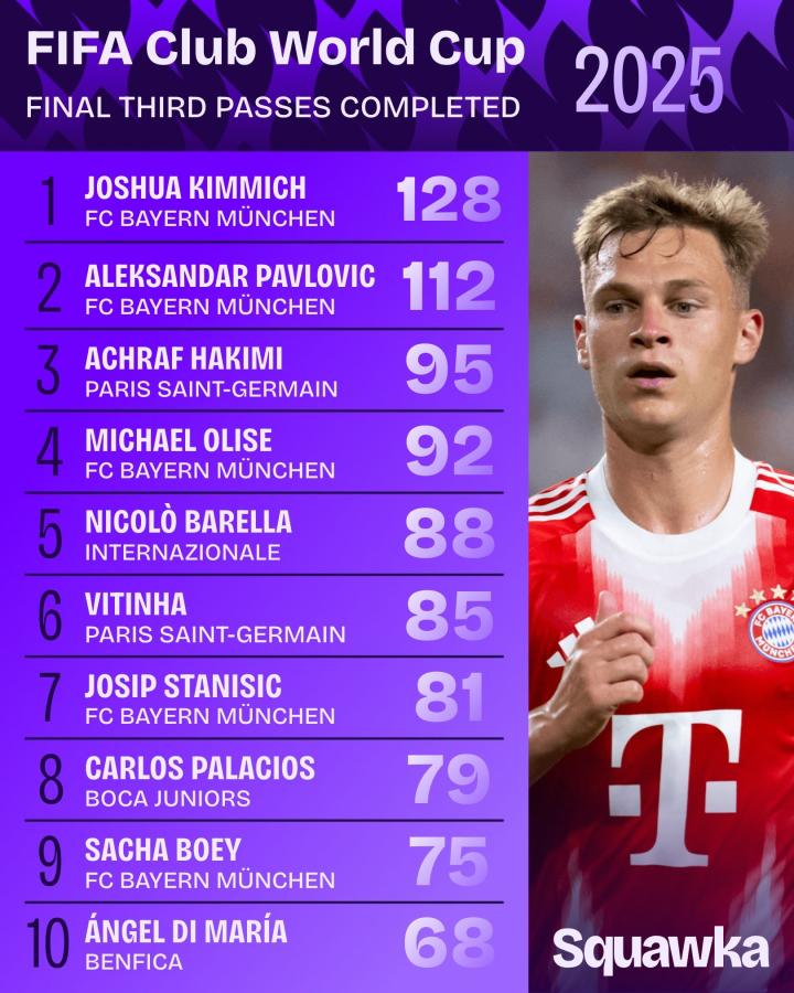 据统计,拜仁慕尼黑的基米希和亚历山大-帕夫洛维奇是本届世俱杯小组赛阶段传球成功进入进攻三区次数最多的两名球员。