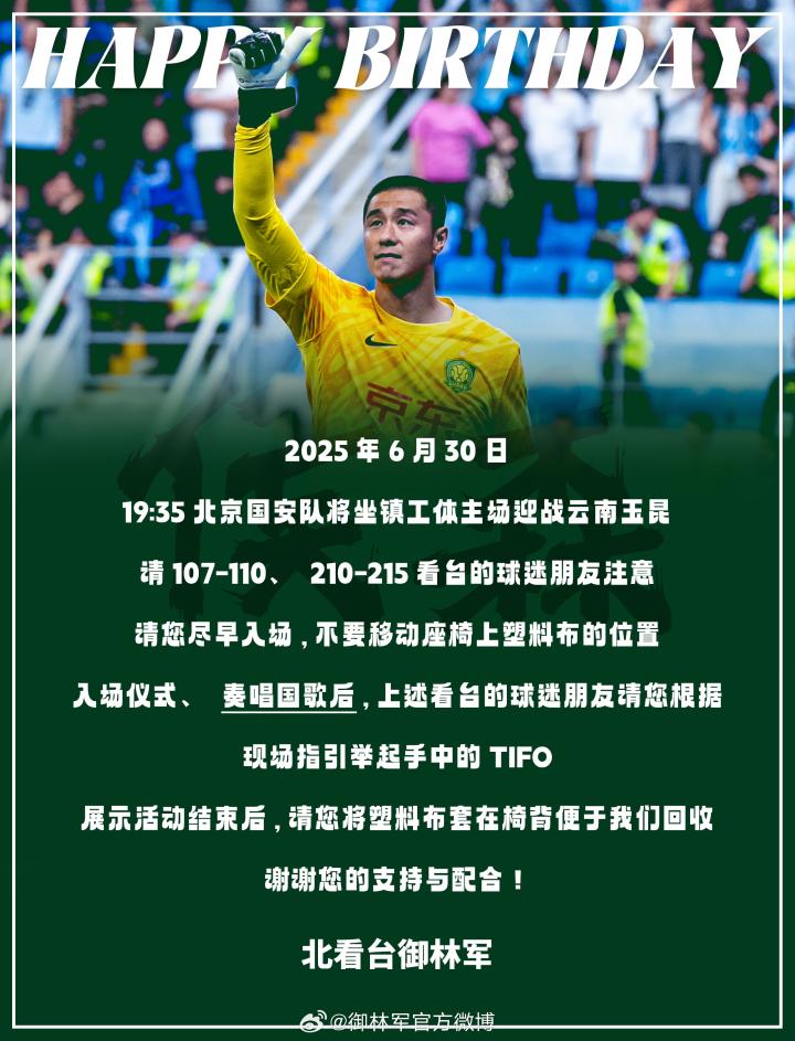 据悉,国安球迷组织御林军将为侯森展示纪念TIFO,并邀请107-110、210-215看台球迷尽早入场。