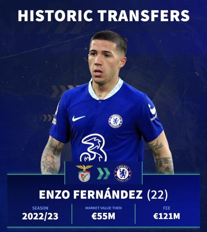 恩佐-费尔南德斯(当时德转身价5500万欧元) 本菲卡>切尔西(2022-23赛季) 1.21亿欧元