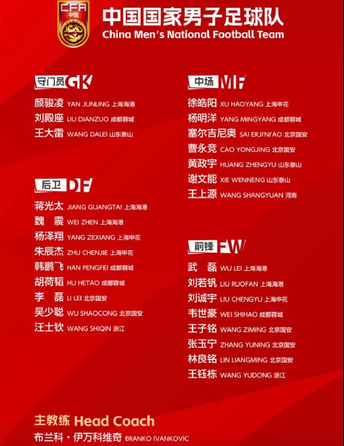 与上次世预赛名单相比,刘殿座、王大雷、蒋光太、杨泽翔、韩鹏飞、胡荷韬、李磊、杨明洋、王上源、武磊、刘若钒、林良铭等12名球员落选。