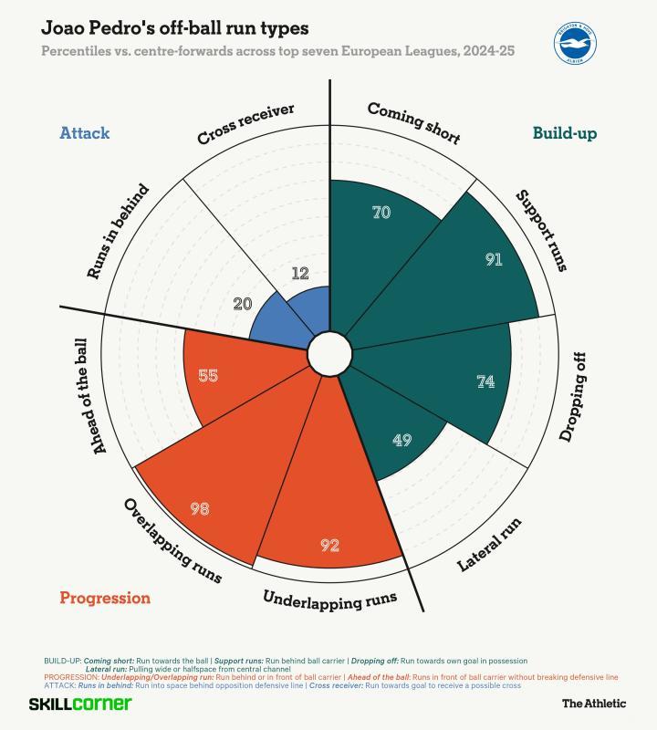 相比之下,若昂-佩德罗在带球跑动时更加自然——他既能为那些想要突破他的球员创造机会,又能带领球队进攻。这一点体现在下方的SkillCorner个人资料中,该资料展示了他每30分钟控球时的跑动类型,并与欧洲七大联赛的中锋进行了比较。