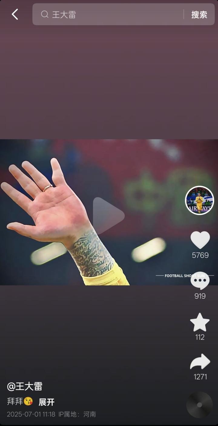 北京时间7月1日上午,王大雷更新了自己的抖音,并写道“拜拜。”