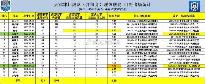此外,门将闫炳良的顶级联赛出场上双,超过了王毅,排名队史门将出场次数第15位。