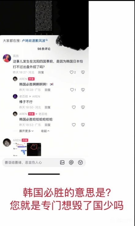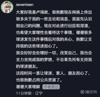 随后卢琦政本人也在这条动态下作出了回应,他表示:“我首先认识到自己的问题,希望大家理性看待这个事情,我会好好处理一切。”