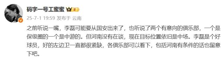 《足球》报记者鲁蜜表示:“之前听说一嘴,李磊可能要从北京国安出来了,也听说了两个有意向的俱乐部,一个是保级圈的一个是中游的。但河南队没有在谈,现在(引援)目标位置依旧是中场。李磊是一名好球员,好的左边卫一直都很紧缺,各俱乐部可以看下,包括河南队有条件的话也留意一下吧。”