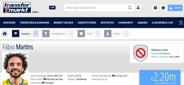 资料显示,目前31岁的法比奥-马丁斯与沙特赛哈特海湾俱乐部的合同已经到期,成为自由球员。上个赛季,法比奥-马丁斯代表赛哈特海湾出战33场比赛,贡献8粒进球和1次助攻。