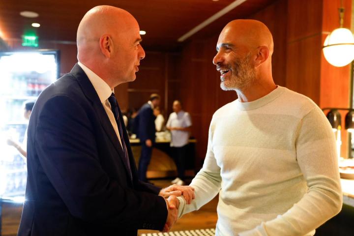 北京时间7月2日,切尔西主帅恩佐-马雷斯卡在迈阿密现场观看了皇家马德里对阵其老东家尤文图斯的世俱杯比赛,并与国际足联主席因凡蒂诺会面。