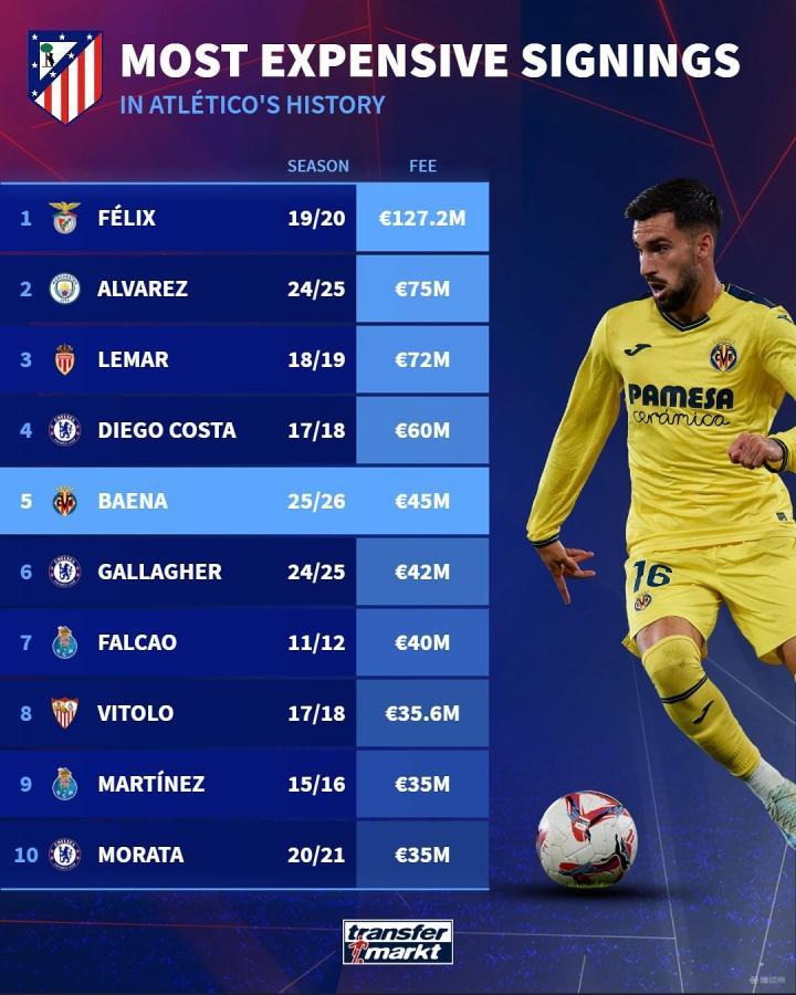 马德里竞技官方宣布从比利亚雷亚尔签下巴埃纳,据悉转会费为4500万欧,据统计,巴埃纳是马竞队史引援花费第五高的球员。