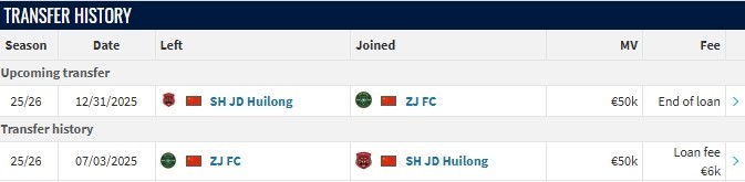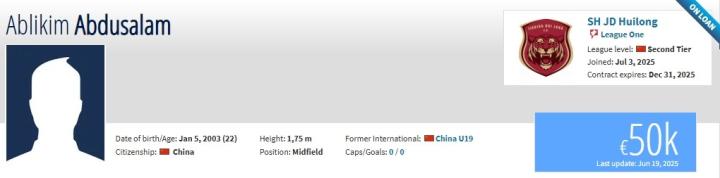 北京时间7月3日,德转更新,浙江队22岁中场阿布力克木租借加盟上海嘉定汇龙。