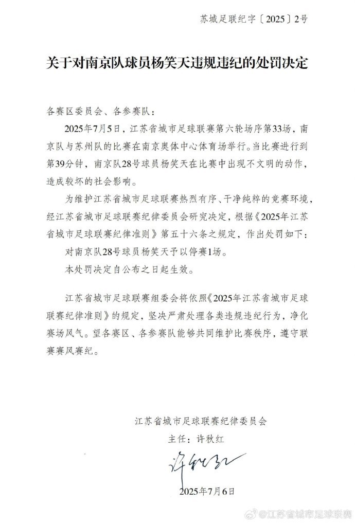 北京时间7月6日,江苏省城市足球联赛官方公布对南京队球员杨笑天不文明动作的处罚。
