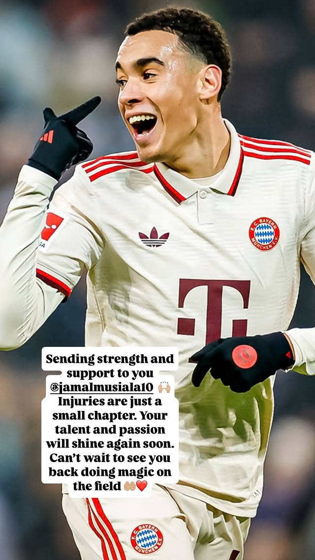 此前拜仁慕尼黑中场穆西亚拉在对阵巴黎圣日耳曼的世俱杯1/4决赛中遭遇重伤,在这之后他也得到了来自足坛各界的慰问。