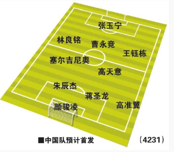 北京时间7月7日,《东方体育日报》预测了国足东亚杯首战对阵韩国队的首发阵容,其中阵型为4-2-3-1,双后腰为塞尔吉尼奥与高天意,单前锋张玉宁,王钰栋、林良铭、曹永竞、汪士钦、高准翼等人出战。
