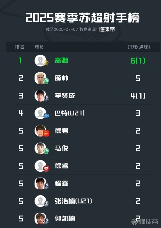 7月6日晚,“苏超”第6轮角逐,宿迁队主场2-2战平连云港队。此役,宿迁队球员高驰打进1球,目前他以6粒进球排在“苏超”射手榜第一位。