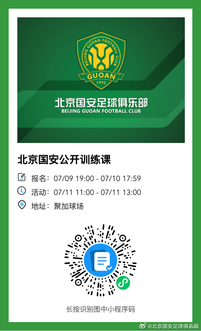 北京时间7月9日,北京国安官方发布了公开训练课报名的信息,7月11日国安一线队将举行公开训练课,9日19:00开启报名。