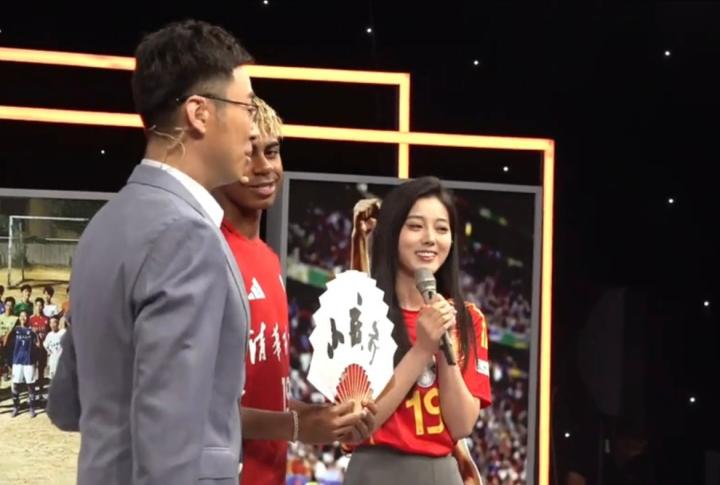 这份礼物是一个印有亚马尔画像的折扇,背面则是中国球迷对他的爱称“小孩哥”,她还在现场教亚马尔用中文说了一句“小孩哥”。