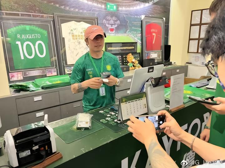 北京时间7月10日,博主@G_life北京 在个人社媒上发布了照片,照片上是北京国安队长张稀哲,他正在国安球迷商店中当收银员,为顾客服务。
