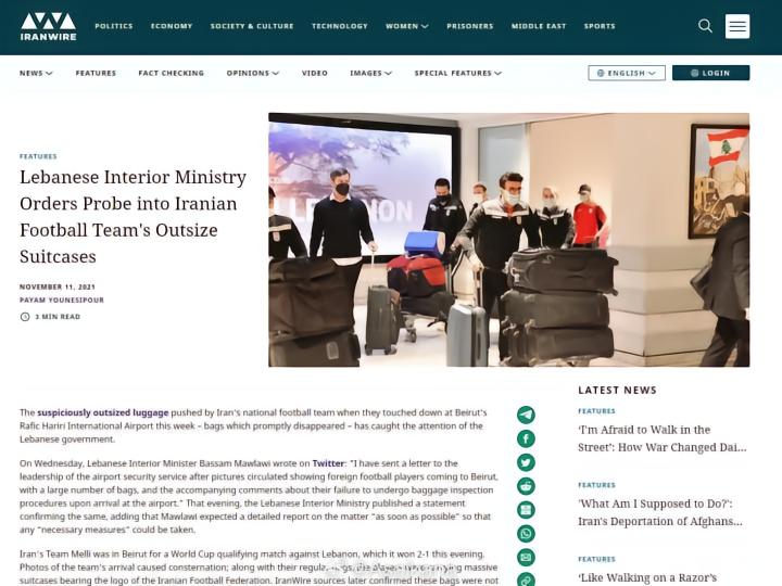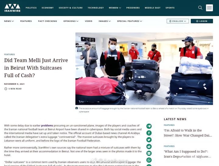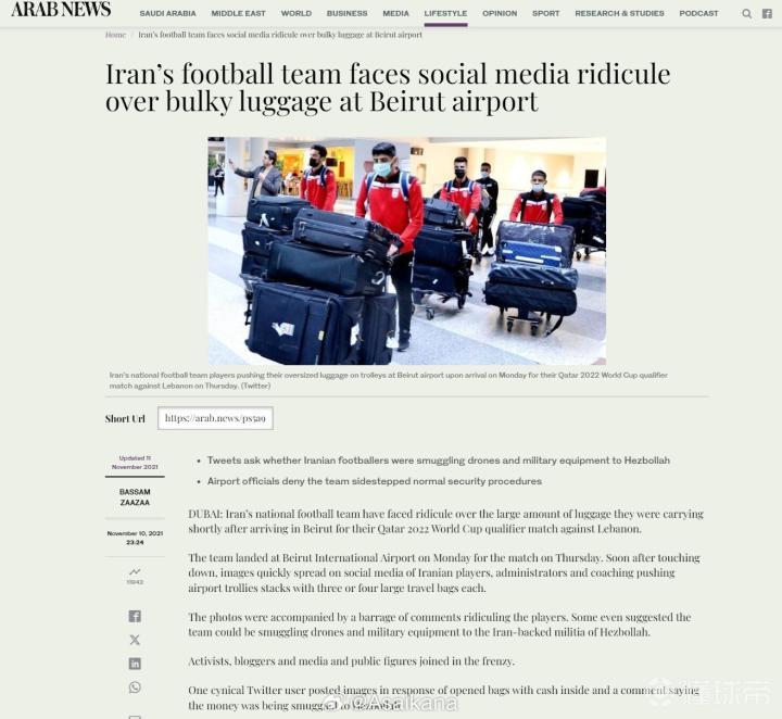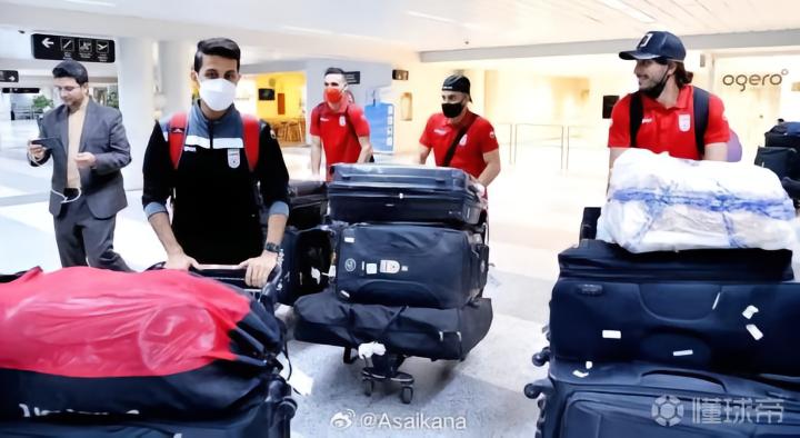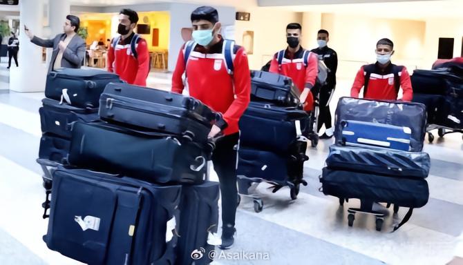 对比案例:2021年11月,伊朗国家队前往黎巴嫩参加卡塔尔世界杯预选赛,到达贝鲁特国际机场后,因被拍到球员、工作人员、教练携带了合计超过100件行李(图1 图2 图3 图4),其中一些体积巨大,受到了来自社交媒体的质疑和嘲笑。