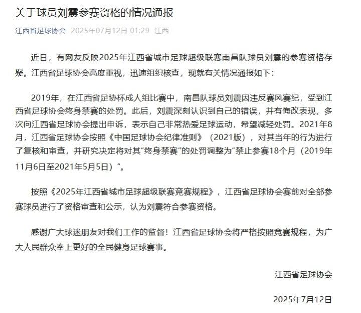 近日,有网友反映2025年江西省城市足球超级联赛南昌队球员刘震的参赛资格存疑。江西省足球协会高度重视,迅速组织核查,现就有关情况通报如下: