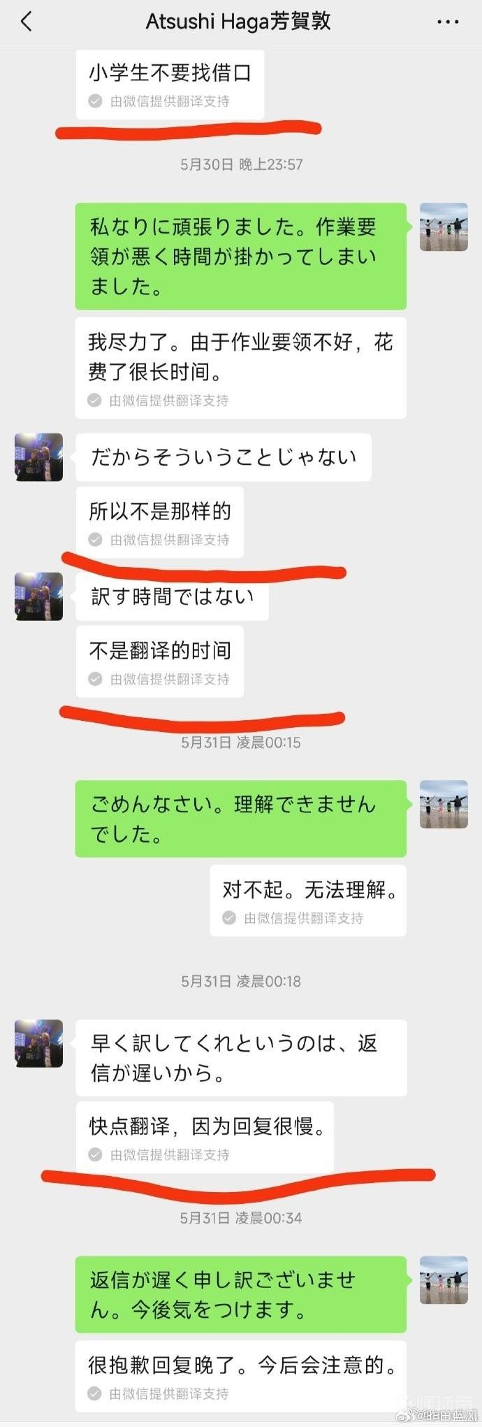 5、事发:5月30日晚23:01-凌晨00:34分因翻译工作,芳贺敦教练开始无理指责和侮辱徐进(详见图),5月31日早上班时间,芳贺敦教练再次无理指责徐进与其发生肢体冲突,并从9:20-9:36指指点点谩骂徐进,次日(6月1日),徐进突发猝死离开了人世。