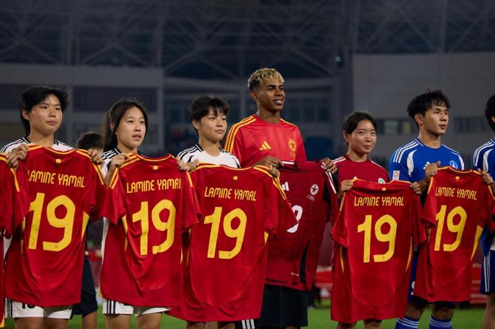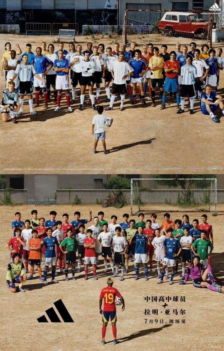 虽然这是17岁的亚马尔第一次来到中国参加活动,但在去年8月,他就通过阿迪达斯与中国高中生运动员们互换了球衣和作业,那张火爆全网的亚马尔手捧“五三”图也是在那时候产生的。2024年12月,亚马尔荣膺世界金童奖,成为“2024年优秀毕业生”,2025年6月,阿迪达斯为CHFL总决赛推出了宣传海报,中国高中球员与亚马尔复刻了那张经典的“何塞+10”,续写了19年前的经典,这张海报也出现在上海、北京等多个城市的CBD,给许多人留下了深刻的印象。