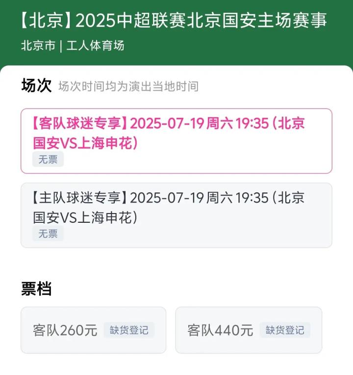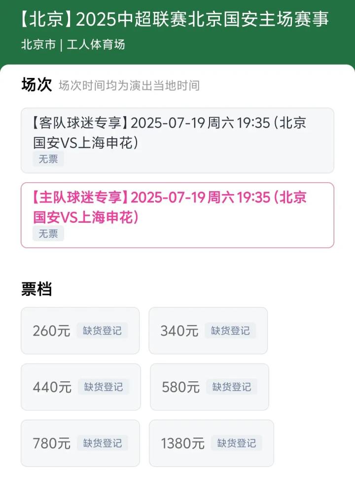 北京时间7月19日晚19:35,中超第17轮,北京国安主场对阵上海申花。今日上午10点整,本场比赛的门票开始发售,开票不到2分钟,所有档次的球票均售罄。
