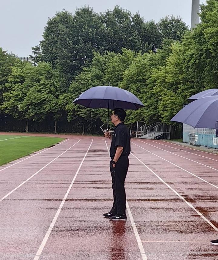 虽然正逢雨天,中国足协主席宋凯、副主席许基仁照例来到训练场,在场边关注着国足的训练。