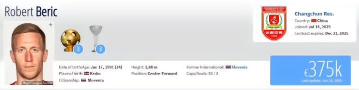 北京时间7月14日,根据德国转会市场网站更新的信息,长春亚泰俱乐部已经撤销了斯洛文尼亚前锋贝里奇的一线队报名,目前显示是在长春亚泰预备队。