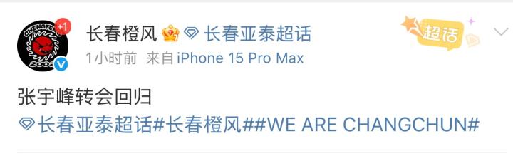 北京时间7月15日,长春橙风球迷会微博账号透露,云南玉昆中场张宇峰夏窗回归长春亚泰效力。