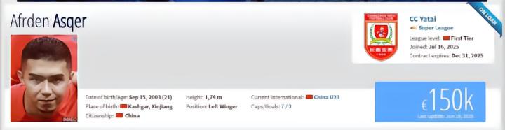 艾菲尔丁出生于2003年9月15日,现年21岁,司职边锋,中国U22男足国脚。