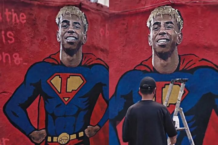 但根据最新图片显示,这个为亚马尔生日所作的壁画被破坏,其超人形象已被涂抹掉。
