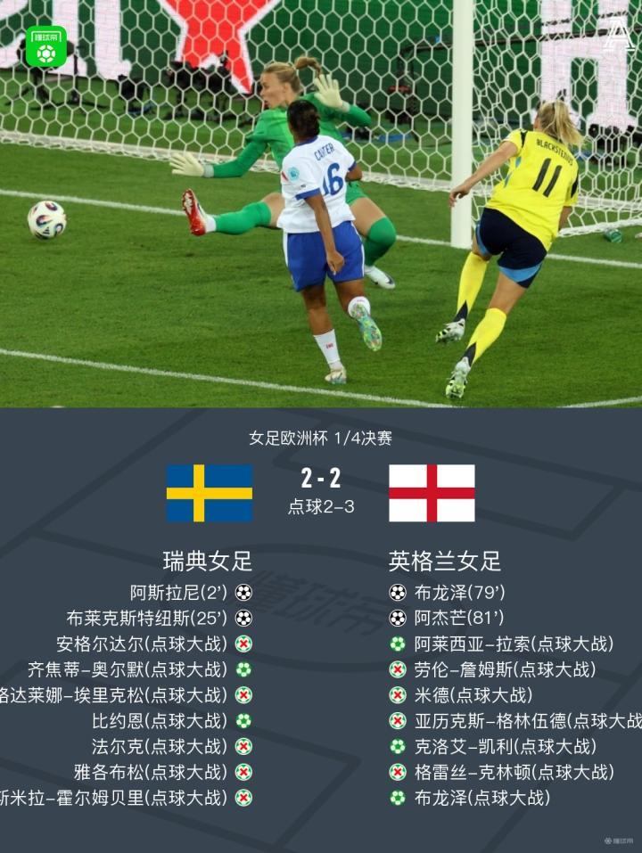点球大战英格兰女足总分5-4淘汰瑞典女足晋级,阿杰芒扳平