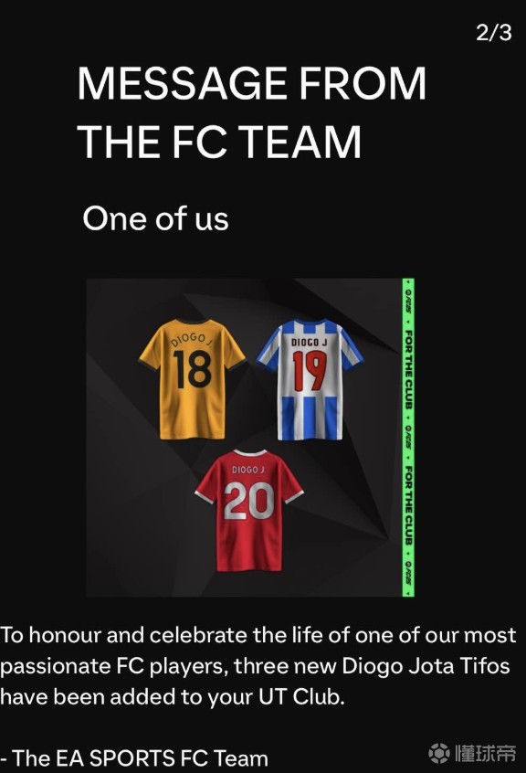 EA官方写道,为纪念我们最有激情的FC玩家,三套若塔TIFO已经发送到你的号上。