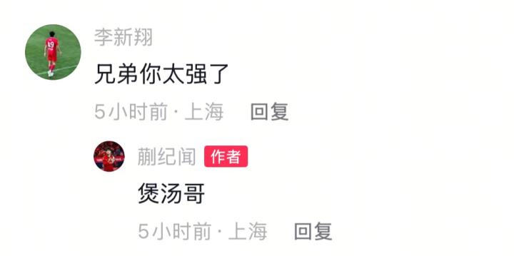 该动态评论区内,队友李新翔留言夸赞:“兄弟你太强了。”随后,蒯纪闻回复:“煲汤哥。”