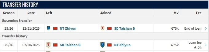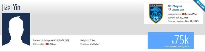 北京时间7月20日,德转更新,山东泰山20岁中场尹嘉熙租借加盟南通支云。