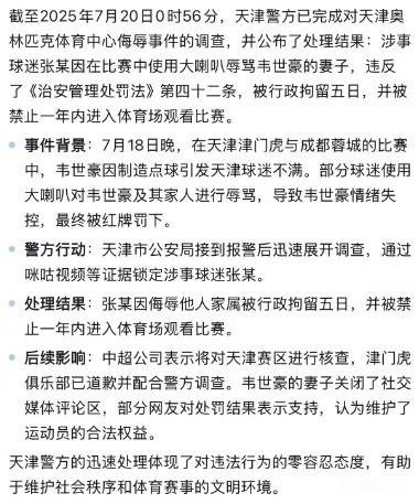 此事发生后不久,网络上流传一张图片。图片上写道:天津警方已经完成了对此事件的调查,对侮辱韦世豪妻子的球迷行政拘留五日,并且禁止入场观赛一年。