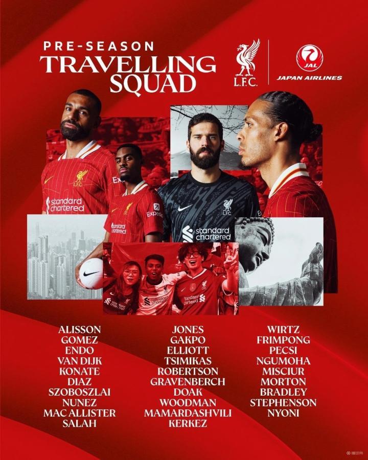 利物浦官方公布了今夏亚洲行大名单,萨拉赫领衔,维尔茨、凯尔凯兹、弗林蓬等新援在列,费代里科-基耶萨缺席。