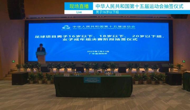 7月21日,中华人民共和国第十五届全国运动会足球项目男子U16、U18、U20组、女子成年组决赛阶段抽签仪式在深圳举行。