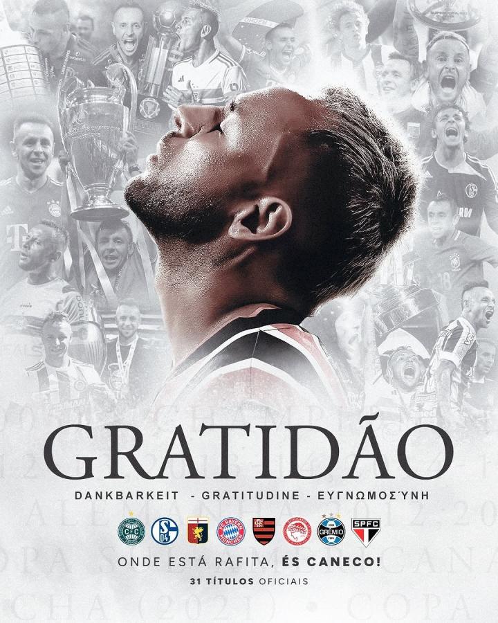 足球给予了我一切,它带我去了德国,让我成为了欧冠冠军、南美解放者杯冠军、巴甲冠军……它让我结识了很多了不起的人,让我实现了一直以来的最大梦想。我感谢库里蒂巴,是它在一开始为我敞开了大门;感谢沙尔克04,它信任一个来自巴西的男孩;感谢拜仁,多年来它是我的家,我在那里收获了足球生涯的所有荣誉;感谢弗拉门戈,在那里我在祖国达到了事业巅峰;感谢圣保罗,我心爱的球队,在那里我有机会为俱乐部赢得一项前所未有的冠军;也要感谢奥林匹亚科斯和格雷米奥!